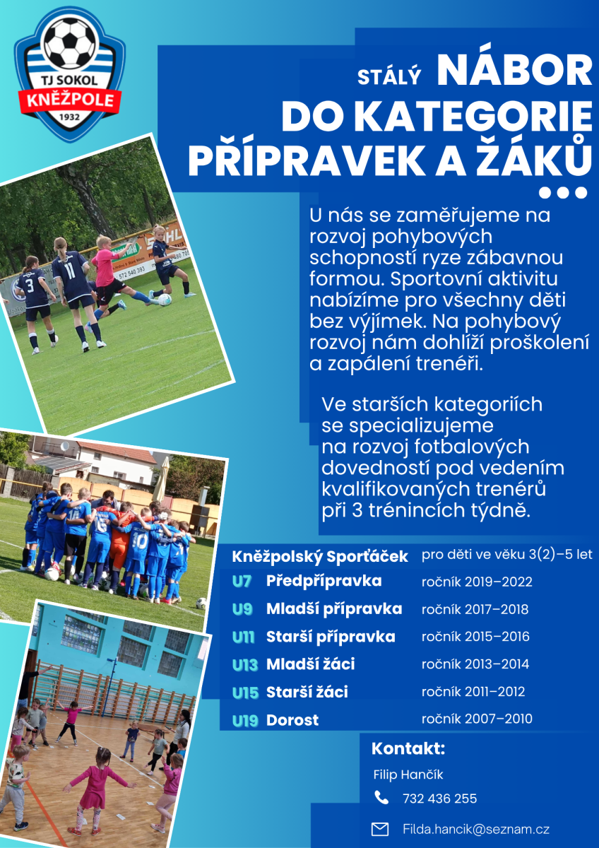 Nové prostředí, nová výzva, noví kamarádi a především spousta zábavy, pohybu, radosti a zážitků, kterých je u nás více než dost!!! Přiveďte Vaše dítě na trénink a dejte mu příležitost zdravého pohybového rozvoje pod vedení kvalifikovaných a zapálených trenérů a trenérek. Nabrané zkušenosti z FAČR a OFS i Coerver Coaching školení předáváme již několik let a jsou pro nás základem ke správnému pohybovému i dovednostnímu rozvoji hráčů a hráček. Každý fotbalista a fotbalistka jsou u nás vítáni.